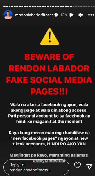 Nagbabala ang social media personality na si Rendon Labador sa publiko hinggil sa pekeng social media pages na naglipana ngayon online na ginagamit ang kaniyang pangalan.
