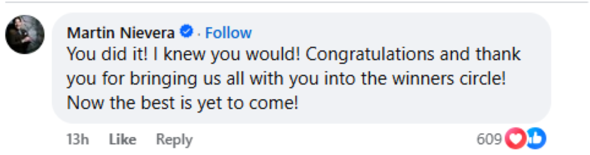 "You did it! I knew you would! Congratulations and thank you for bringing us all with you into the winners circle! Now the best is yet to come!" anang Martin.