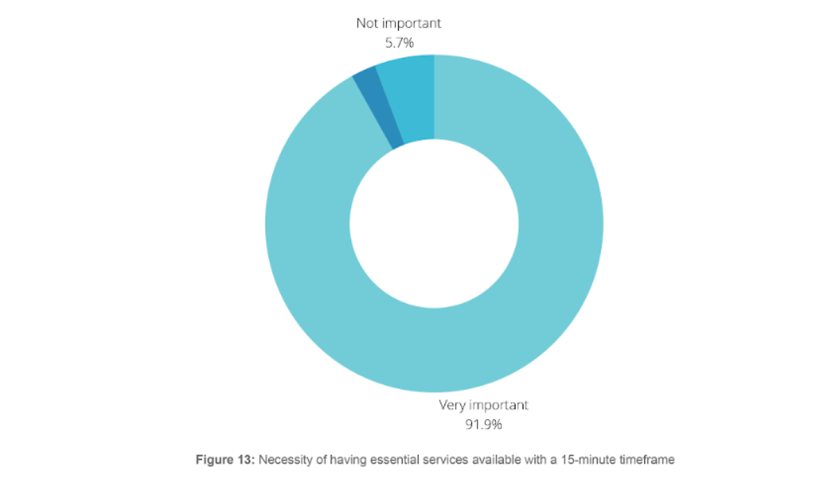 Sa isang survey ng 420 residente — pantay na hinango mula sa inner-city districts, informal settlements and outer suburbs — 82 porsiyento ang nagsabing mas gusto nilang manirahan, magtrabaho, at mag-access ng mga pangunahing serbisyo sa loob ng 15 minutong lakad o pagbibisikleta mula sa kanilang tahanan. Gayunpaman, 76 porsiyento ang umamin na patuloy pa rin silang lumalabas ng kanilang komunidad dahil pakiramdam nila ay kulang ang mga lokal na pagpipilian.