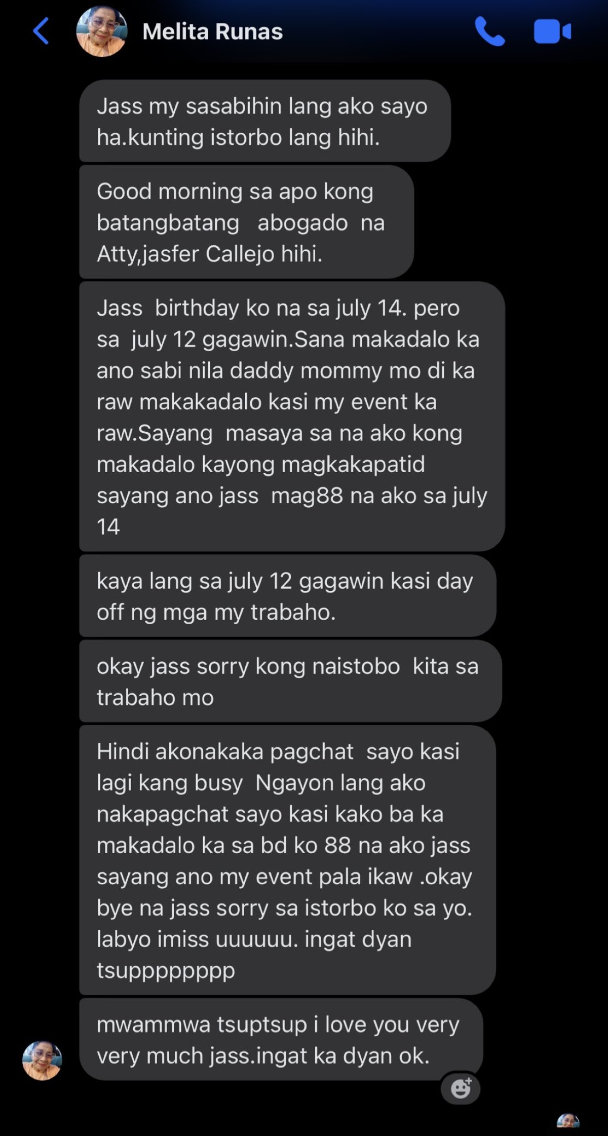 Batay sa messages, nakatakda umanong ganapin sa Hulyo 14 ang kaarawan ng lola niya. Ngunit nagpagpasyahang ilipat na lang sa Hulyo 12 dahil walang pasok ang karamihan.