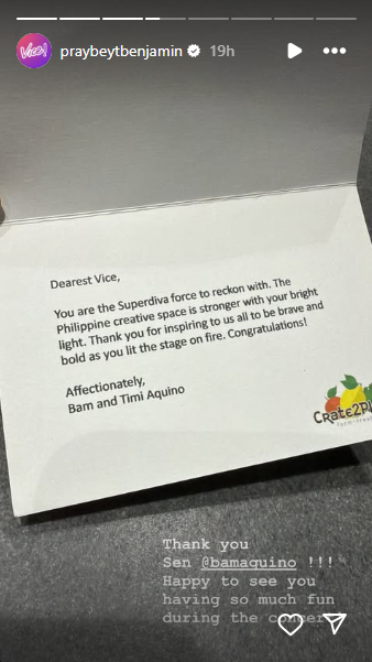 Mababasa, "Dearest Vice, You are the Superdiva force to reckon with. The Philippine creative space is stronger with your bright light. Thank you for inspiring to us all to be brave and bold as you lit the stage on fire. Congratulations!"