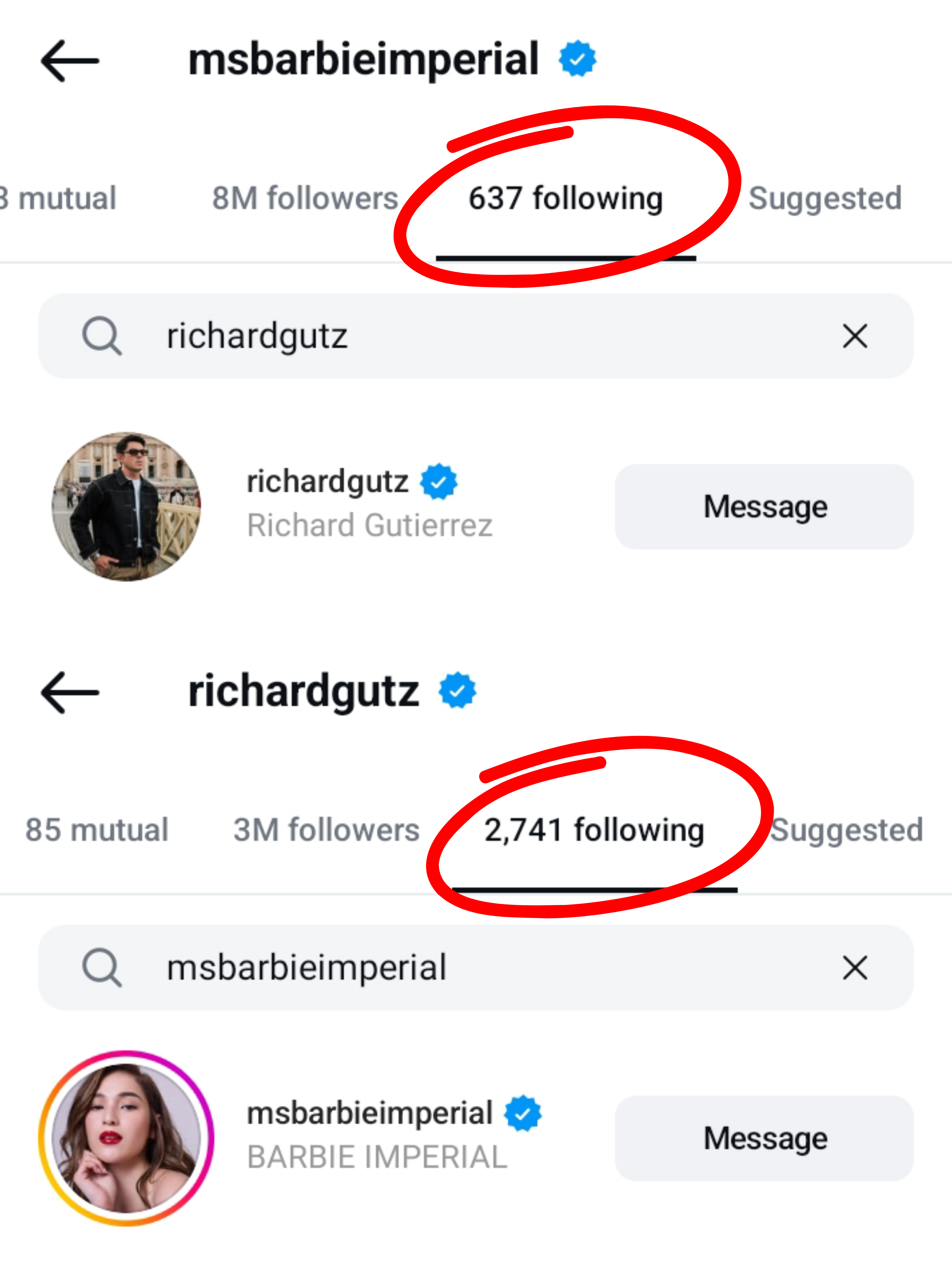 Kung pagbabatayan ang unang set ng screenshots, makikitang may fina-follow na lamang na 636 si Barbie, at wala rito ang IG account ni Richard.