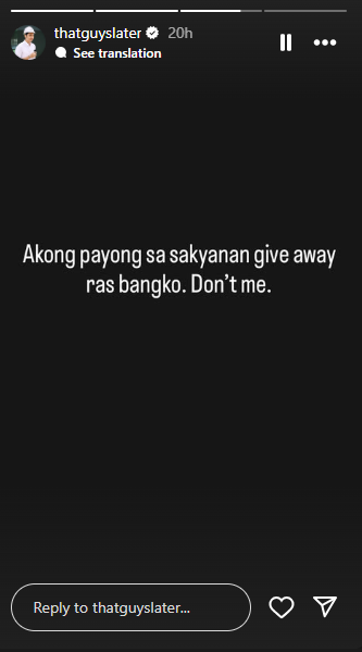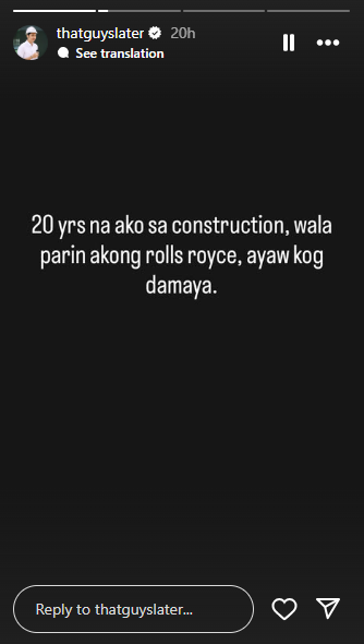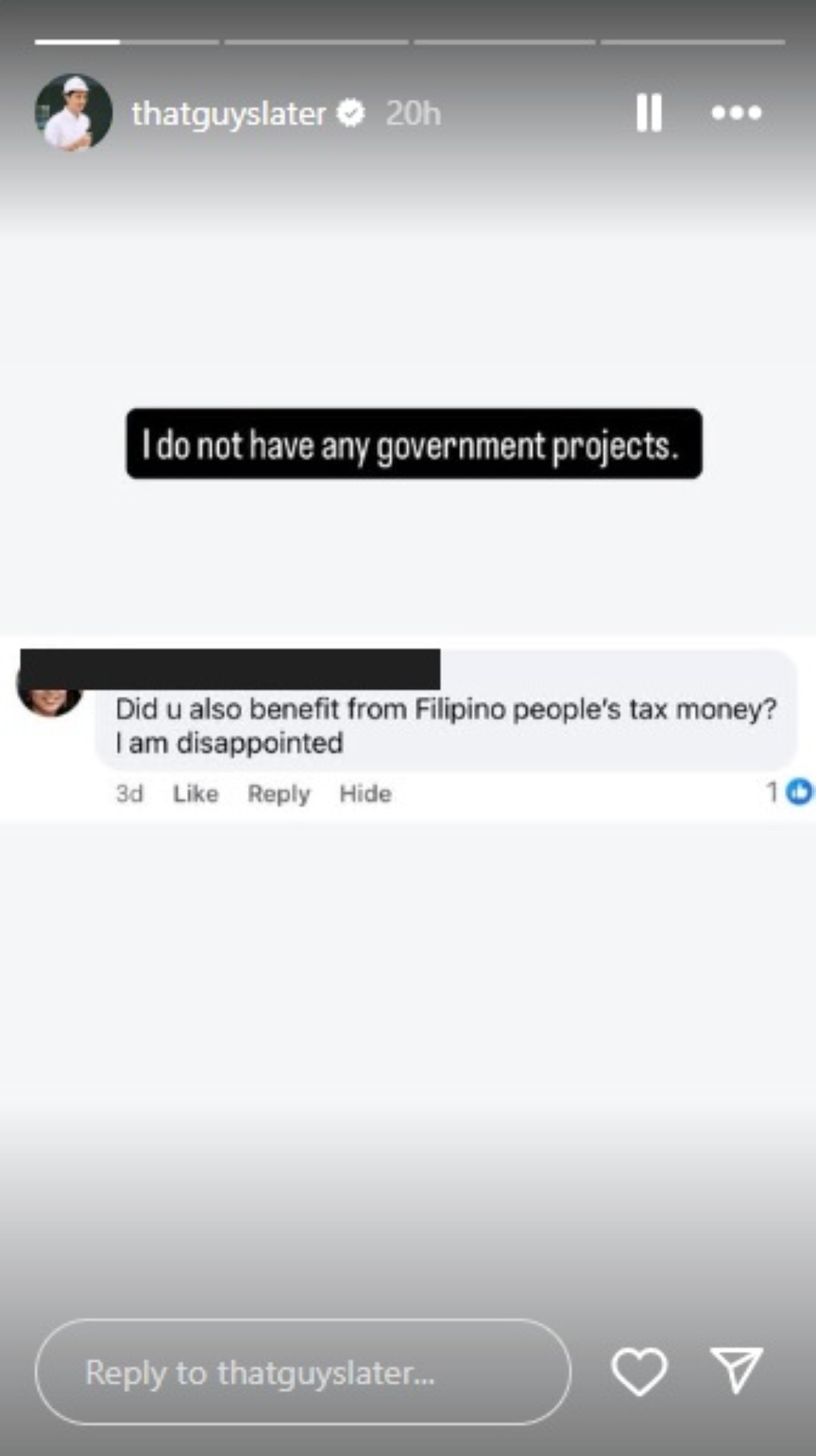 Sa Instagram stories ni Slater, ibinahagi niya ang screenshot ng komento ng isang netizen na nagtanong sa kaniya kung isa rin ba siya sa mga project contractor ng pamahalaan, na nasa balag ngayon ng isyu dahil sa umano'y katiwalian.