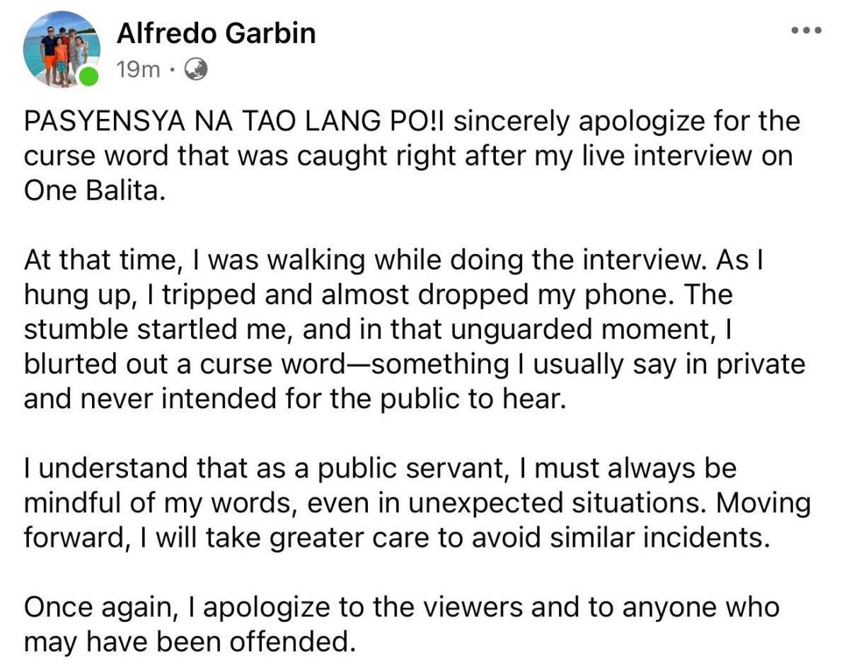 "Pasensya na tao lang po! I sincerely apologize for the curse word that was caught right after my live interview on One Balita,” ani Garbin.