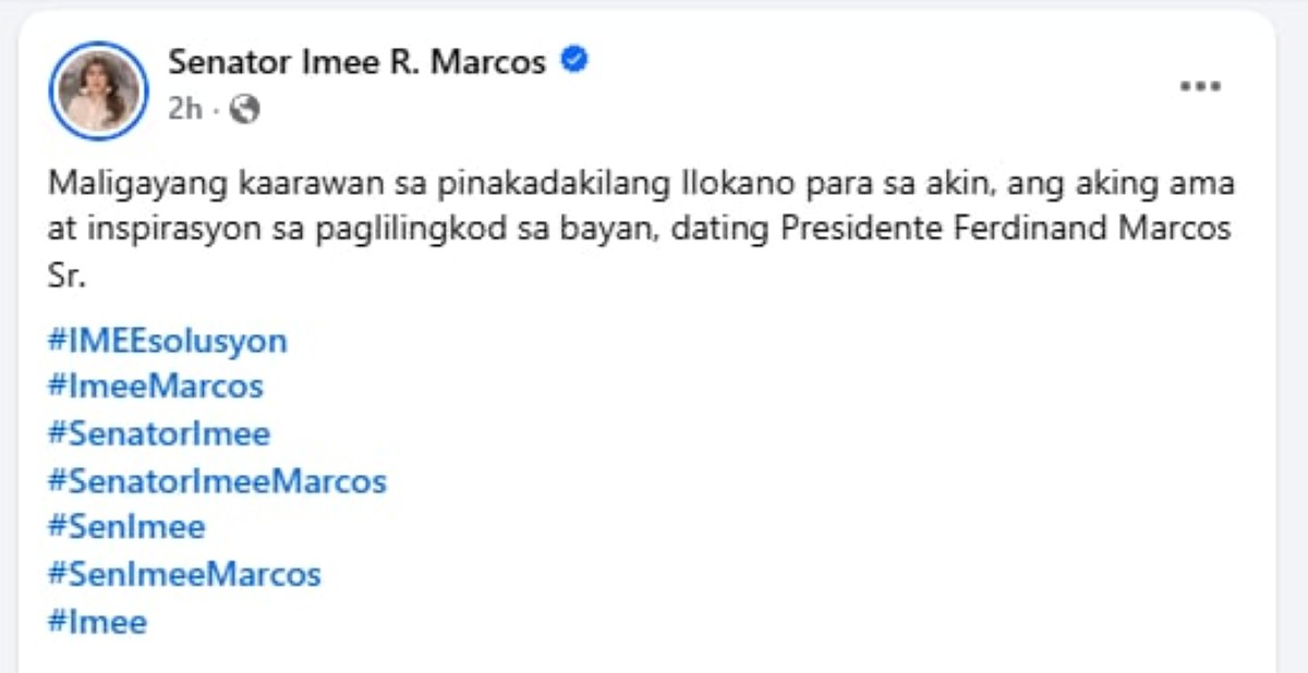 Ibinahagi rin ni Senadora Imee Marcos, ang panganay na anak ni dating Pangulong Marcos Sr., sa kaniyang Facebook post ang kaniyang pagbati sa kaarawan ng ama. Aniya, ito raw ay ang kaniyang inspirasyon sa paglilingkod sa bayan.