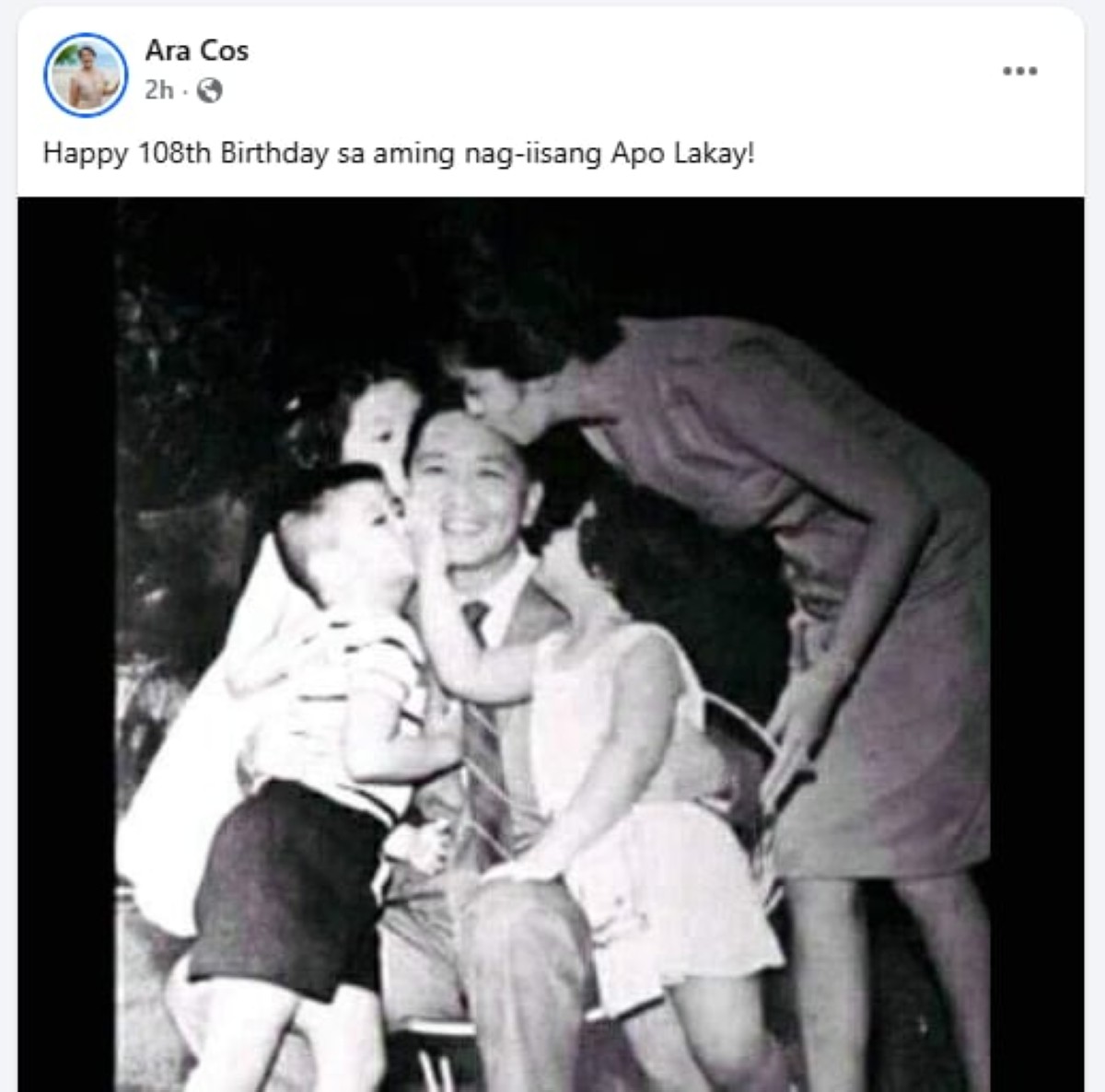 “Happy 108th Birthday sa aming nag-iisang Apo Lakay!” aniya kalakip ang kanilang litrato habang sila ay bata pa, kasama ang kanilang mga magulang.