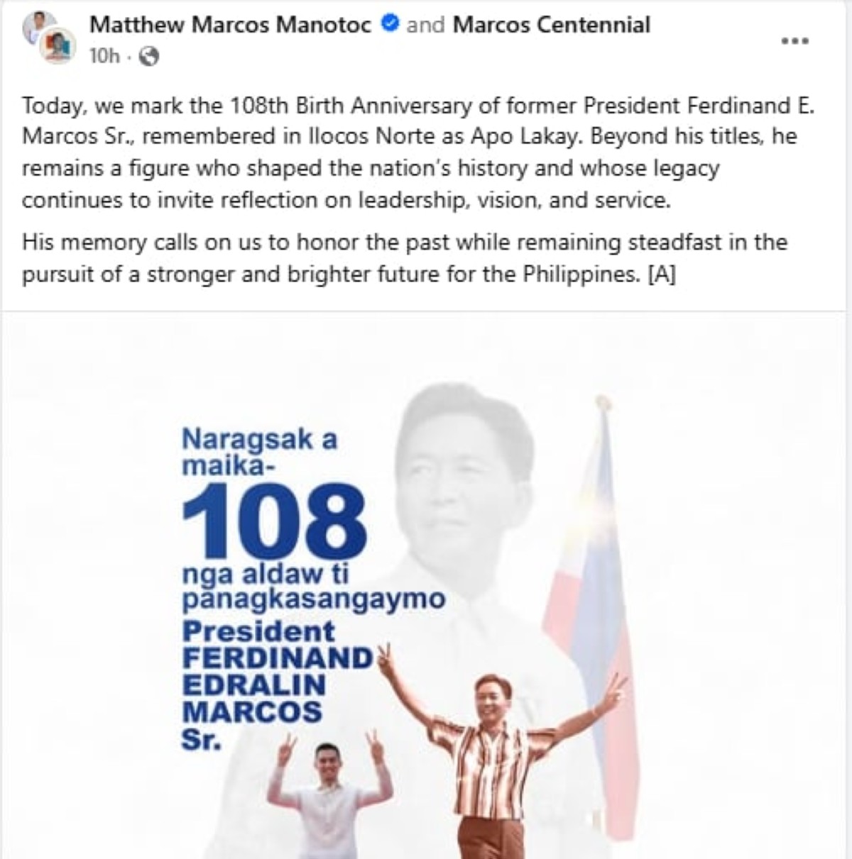 “Today, we mark the 108th Birth Anniversary of former President Ferdinand E. Marcos Sr., remembered in Ilocos Norte as Apo Lakay. Beyond his titles, he remains a figure who shaped the nation’s history and whose legacy continues to invite reflection on leadership, vision, and service,” ani Manotoc.