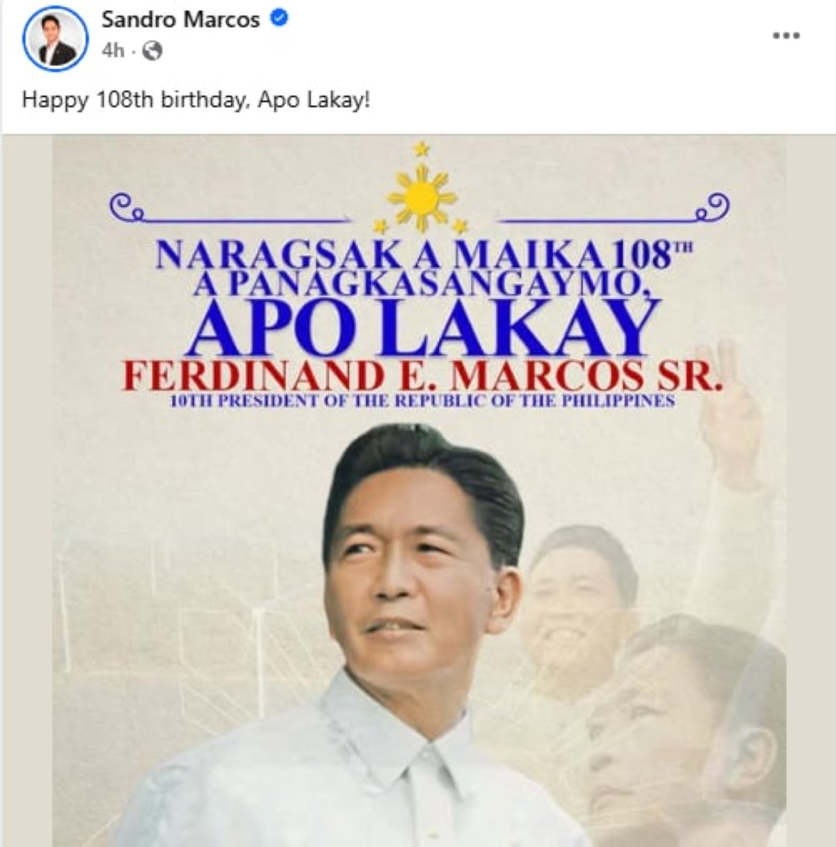 “Maligayang kaarawan sa pinakadakilang Ilokano para sa akin, ang aking ama at inspirasyon sa paglilingkod sa bayan, dating Presidente Ferdinand Marcos Sr.,” ani Marcos.