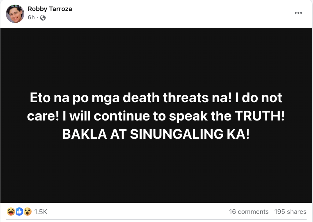 Samantala, sa panibagong Facebook post nitong Sabado, Setyembre 13, sinabi ni Tarroza na kahit nakatanggap na raw siya ng death threats ay patuloy pa rin daw niyang isisiwalat ang "katotohanan."