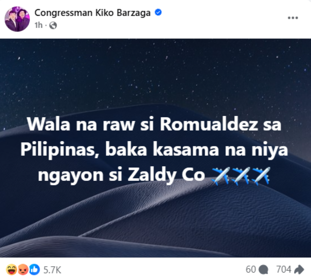 "Wala na raw si Romualdez sa Pilipinas, baka kasama na niya ngayon si Zaldy Co," aniya.