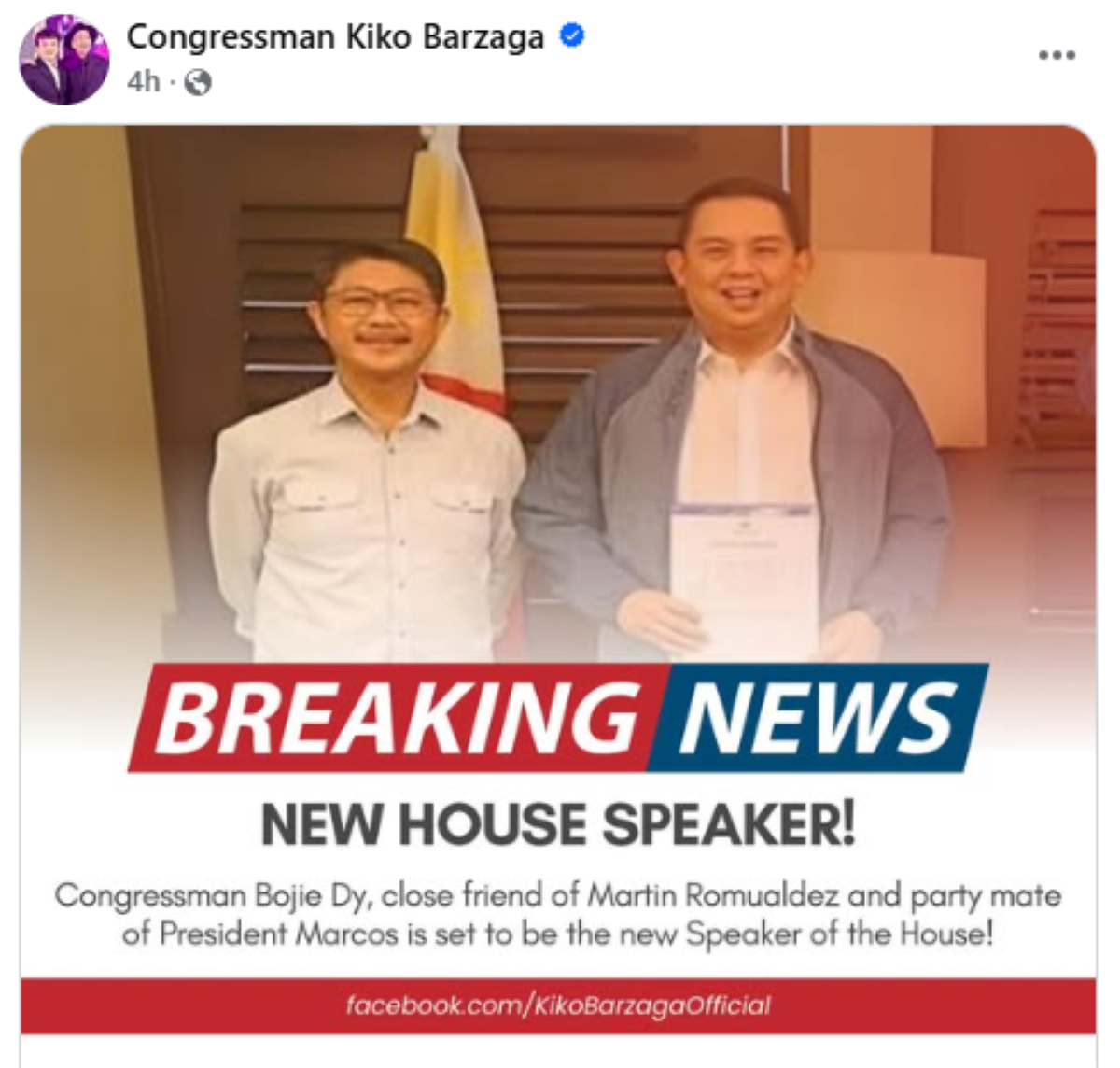 Sa Facebook page naman ni Barzaga, tila nagbigay na siya ng kumpirmasyong may bago na ngang House Speaker.