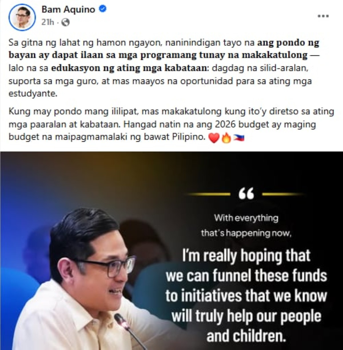 Aniya pa sa hiwalay na post, naninindigan pa rin siya sa kabila ng mga hamong hinaharap ng bansa, na mapunta sa mga programang matutulong talaga ng pera ng taumbayan.