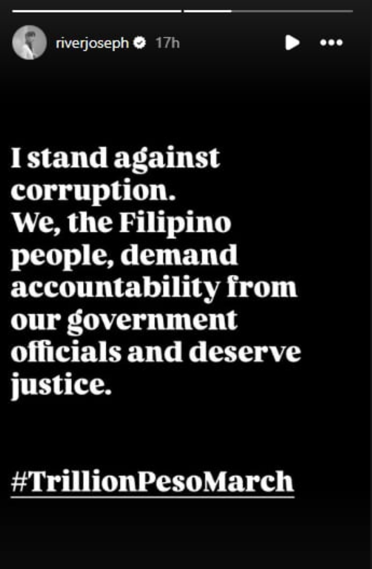 “I stand against corruption. We, the Filipino people, demand accountability from our government officials and deserve justice. #TriliionPesoMarch,” saad niya sa hiwalay na story.