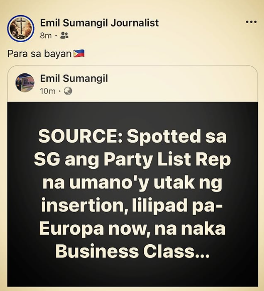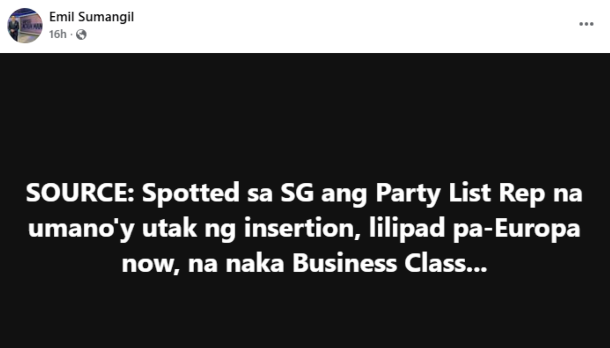 Nakalagay sa kaniyang post, published as is, "SOURCE: Spotted sa SG ang Party List Rep na umano'y utak ng insertion, lilipad pa-Europa now, na naka Business Class..."