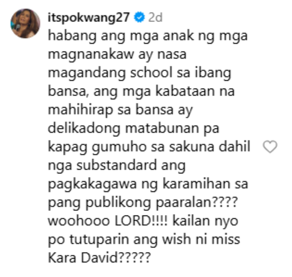 Sa comment section, hindi napigilan ni Pokwang ang pagkadismaya at pagkabahala para sa kaligtasan ng kabataang Pilipino, lalo na sa mga nasa public school. Aniya, habang ang mga anak ng mga "magnanakaw" ay nag-aaral sa mga prestihiyosong eskuwelahan sa ibang bansa, ang mga batang mahihirap naman dito sa Pilipinas ay nanganganib na madamay o matabunan kung sakaling gumuho ang mga silid-aralan sa panahon ng sakuna.