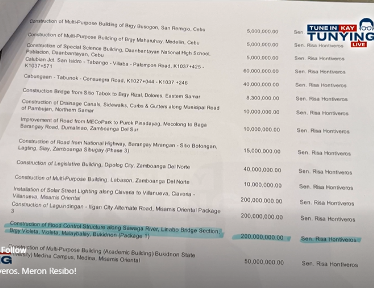 Isa pa sa mga na-highlight sa dokumento ang "Construction of Flood Control Structure along Sawaga River, Linabo Bridge Section, Brgy. Violeta, Violeta, Malaybalay, Bukidnon na umano'y may halagang ₱200,000,000.