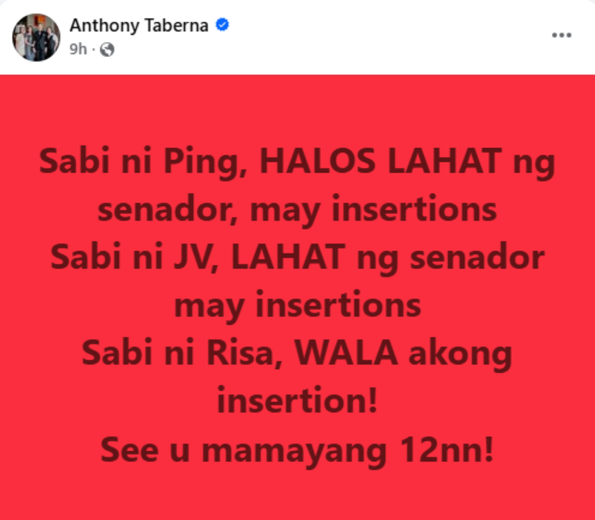 Ang pinagbatayan naman daw ng sinabi ni Taberna ay ang naging pahayag ni Senate President Pro Tempore at chairman ng Senate Blue Ribbon Committee na si Sen. Panfilo Lacson na halos lahat ng senador ng 19th Congress ay may insertion, na papalo sa halos ₱100 bilyon sa 2025 GAA.
