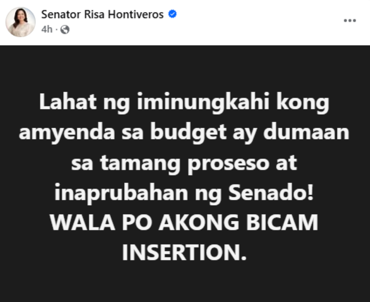 "WALA PO AKONG BICAM INSERTION," pagdidiin ni Hontiveros sa kaniyang post nitong Sabado, Oktubre 4.