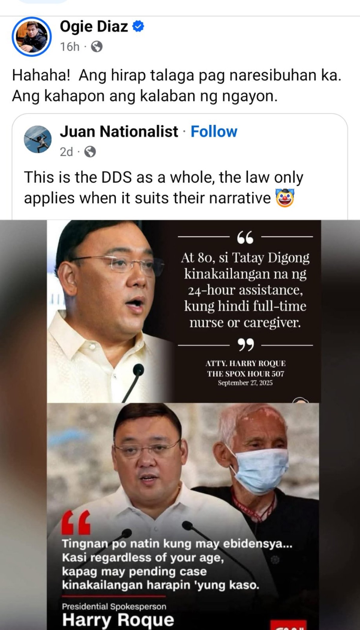 Kaya sa latest Facebook post ni Ogie nitong Sabado, Oktubre 4, natawa si Ogie sa pagpapakita ng tila selective compassion ni Roque.