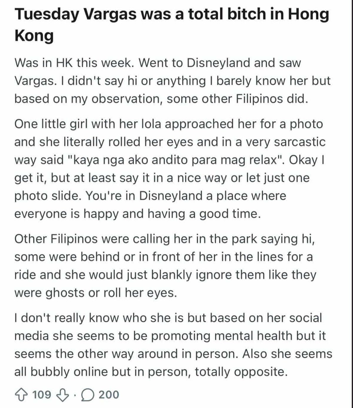 “Your comsec can attest that the post is not true. I saw u once sa anniv gig ng Route 196. Sa sobrang daming tao and hindi naliligpit mga tables, you actually cleaned a couple tables. Sabi mo pa, tutal na naka black din naman ako..makapagligpit na nga lang. Hehe. Thats how down to earth Tuesday Vargas is.”