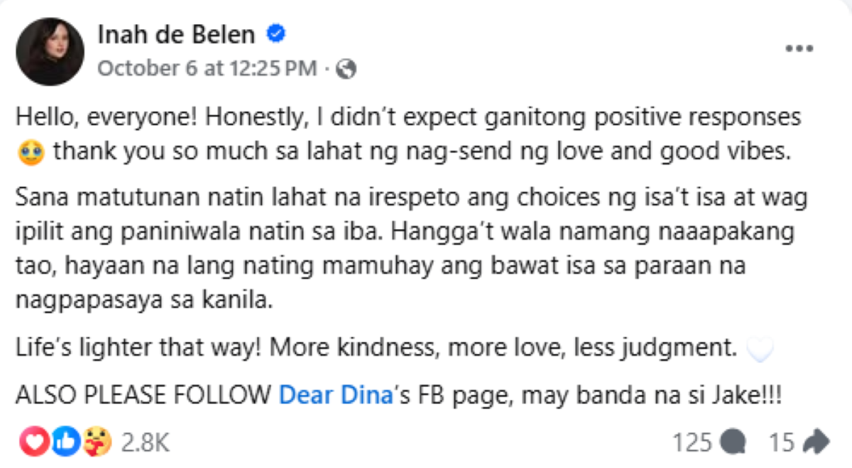 Paalala naman ni Inah sa lahat, matutuhan daw sana ang paggalang sa choices ng bawat isa, at huwag ipilit ang sariling paniniwala sa iba.