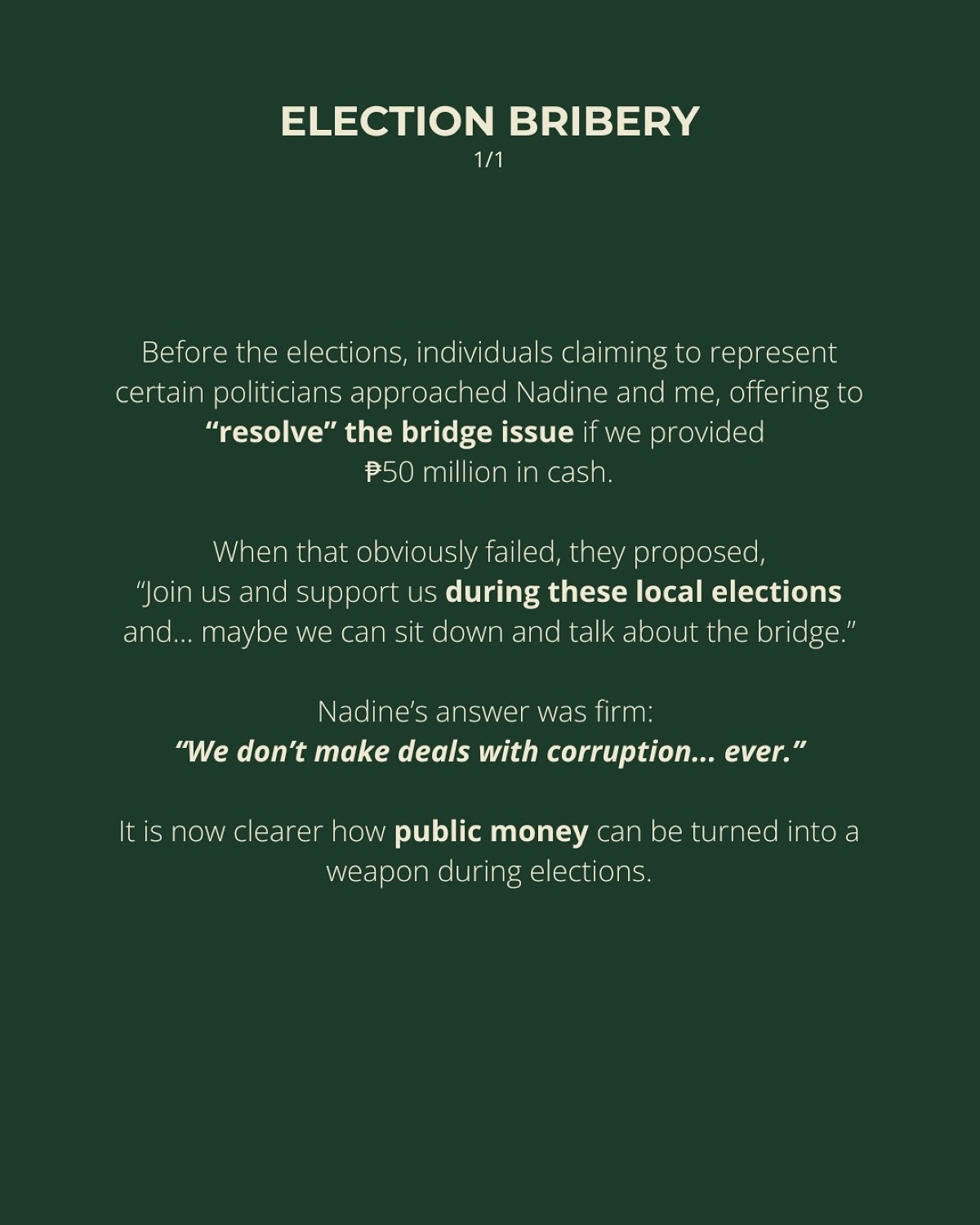 "Before the elections, individuals claiming to represent certain politicians approached Nadine and me, offering to 'resolve' the bridge issue if we provided ₱50 million in cash," aniya.