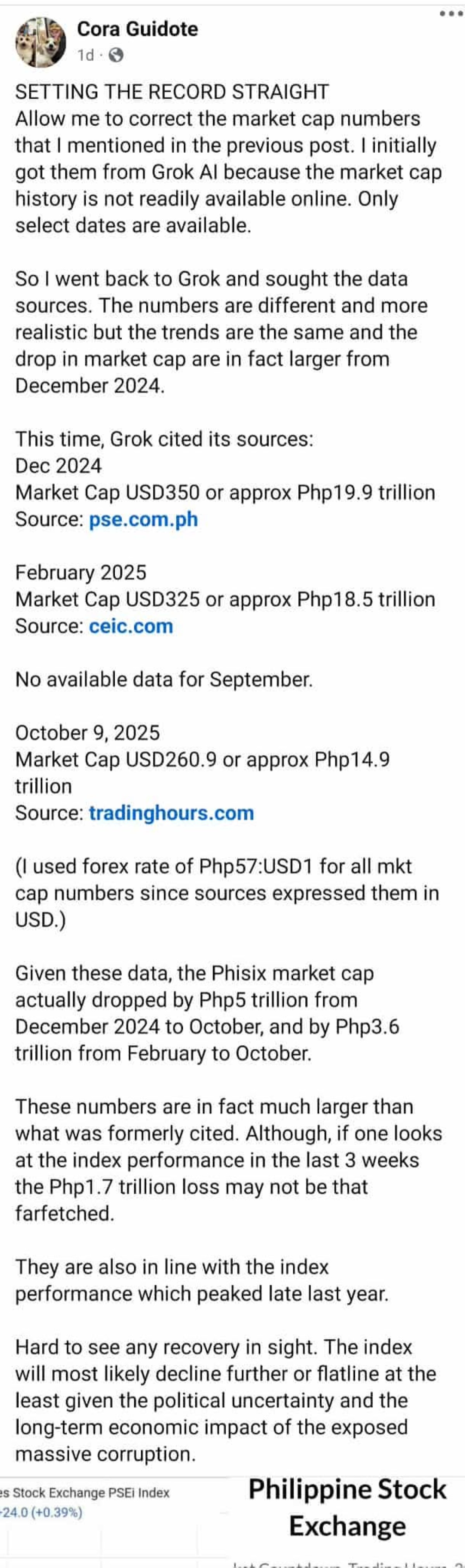 At batay sa mga inilatag niyang numero, umabot sa ₱19.9 trilyon ang PSE market capitalization noong Disyembre 2024, ₱18.5 trilyon noong Pebrero 2025, at ₱14.9 trilyon noong Oktubre 9.