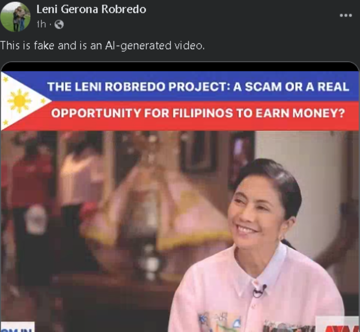 “To join and start receiving passive income automatically do not click on fake links,” sagot ni Robredo sa AI-generated video. “The link below this video is official and by using it you can truly start earning. I personally guarantee this.”
