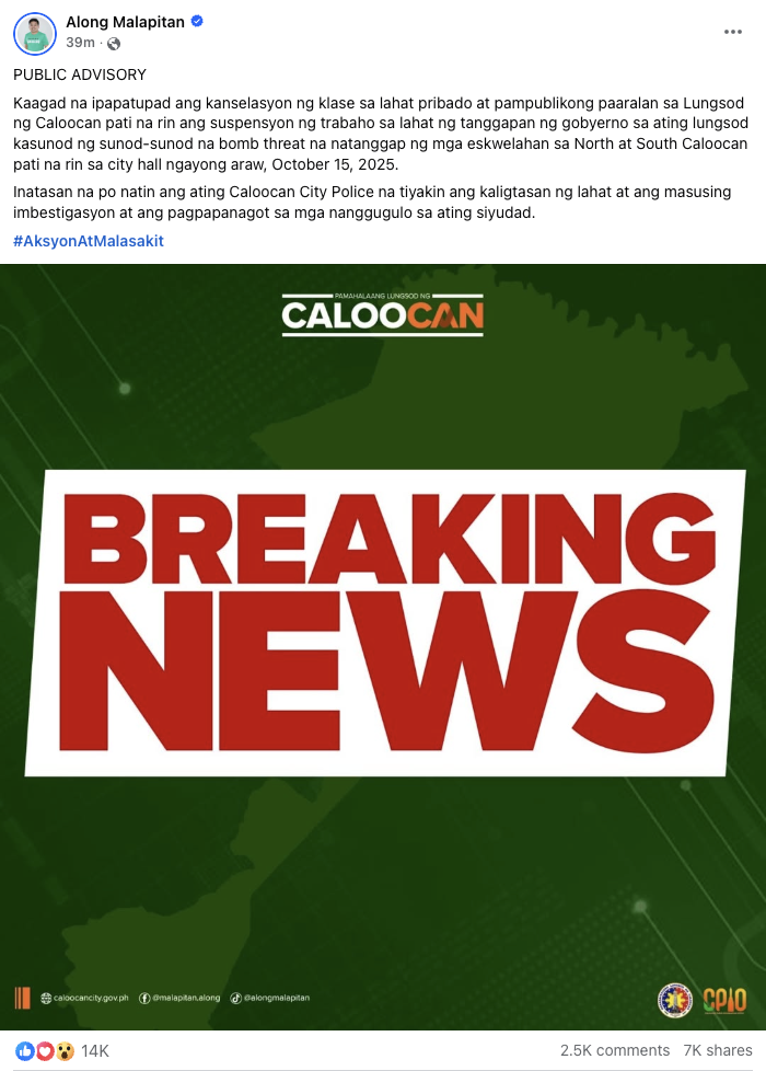 Sinuspinde ni Mayor Along Malapitan ang klase sa lahat pribado at pampublikong paaralan at trabaho sa gobyerno sa Caloocan ngayong Miyerkules, Oktubre 15, dahil sa sunod-sunod na bomb threat na kanilang natanggap.