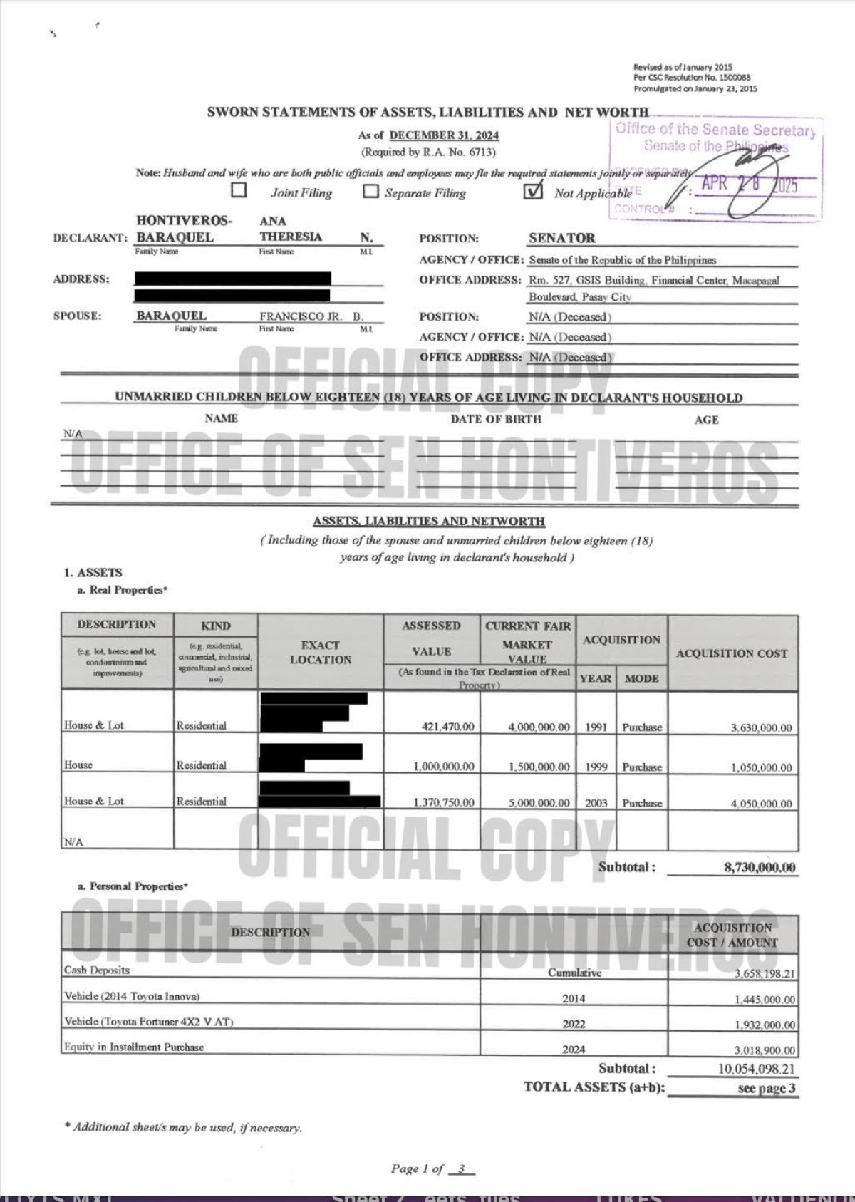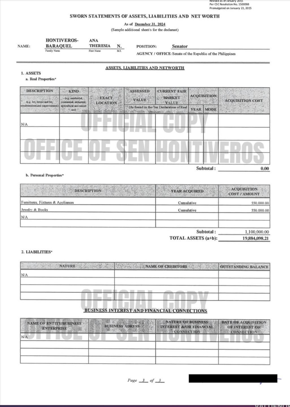 Isinapubliko ni Senador Risa Hontiveros ang kopya ng kaniyang Statement of Assets, Liabilities, and Net worth (SALN) para sa taong 2024.