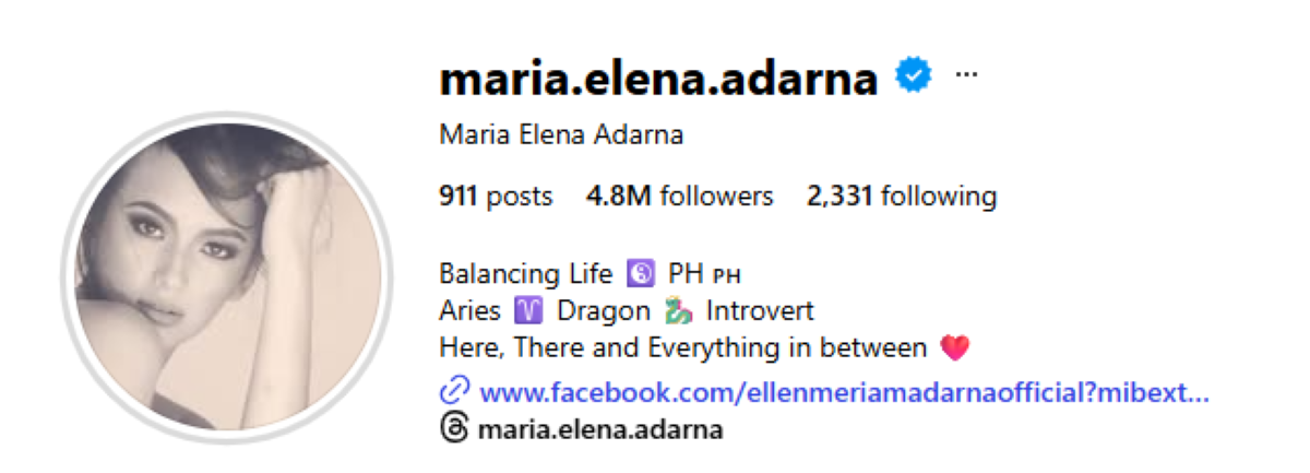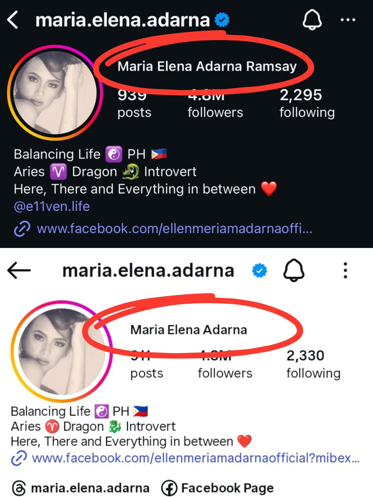 Ibinahagi sa ulat ng Fashion Pulis ang screenshots kung saan mababasa pa noon sa pangalan ng IG account ang pangalang "Maria Ellen Adarna Ramsay."