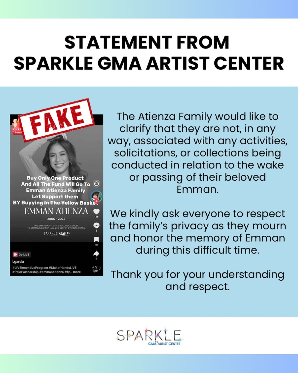 Sa isang Facebook post ng Sparkle nitong Sabado, Oktubre 25, nilinaw nilang walang anomang kinalaman ang pamilya Atienza sa kumakalat na solicitation para sa burol ni Emman.