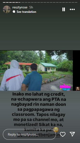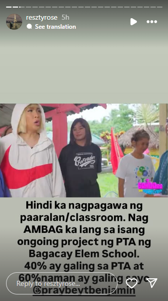 "Hindi ka nagpagawa ng paaralan/classroom. Nag AMBAG ka lang sa isang ongoing project ng PTA ng Bagacay Elem. School. 40% ay galing sa PTA at 60% naman ay galing sayo @praybeytbenjamin," mababasa pa sa isa sa mga pagsita ni Rosell kay Meme.