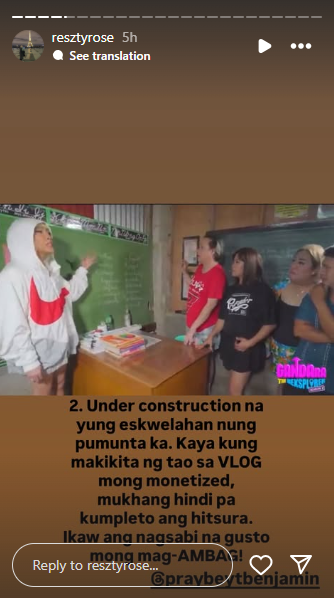 Aniya pa, "Under construction na yung eskwelahan nung pumunta ka. Kaya kung makikita ng tao sa VLOG mong monetized, mukhang hindi pa kumpleto ang hitsura. Ikaw ang nagsabi na gusto mong mag-AMBAG!"