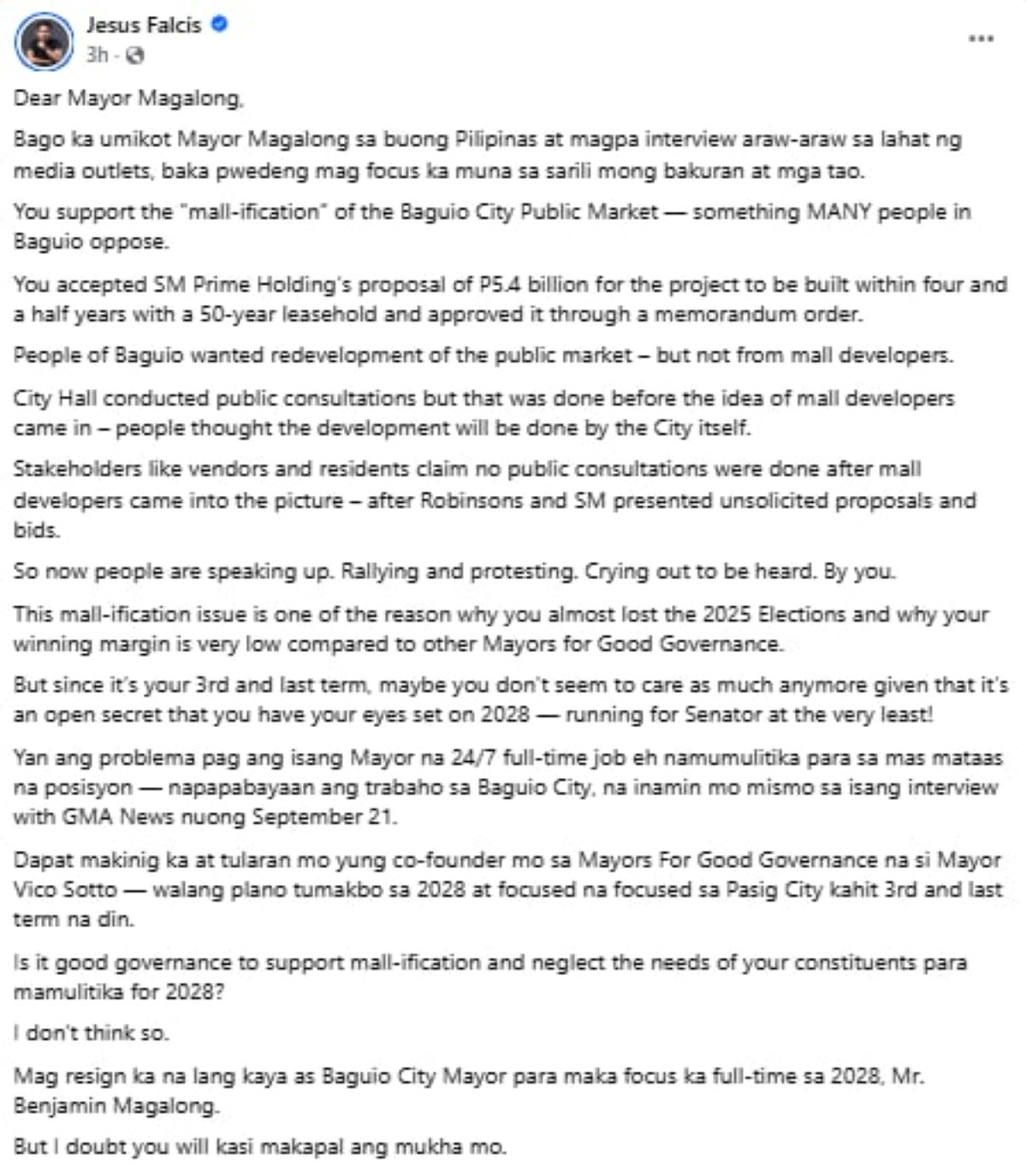 “Yan ang problema pag ang isang Mayor na 24/7 full-time job eh namumulitika para sa mas mataas na posisyon — napapabayaan ang trabaho sa Baguio City, na inamin mo mismo sa isang interview with GMA News nuong September 21,” saad ni Falcis.