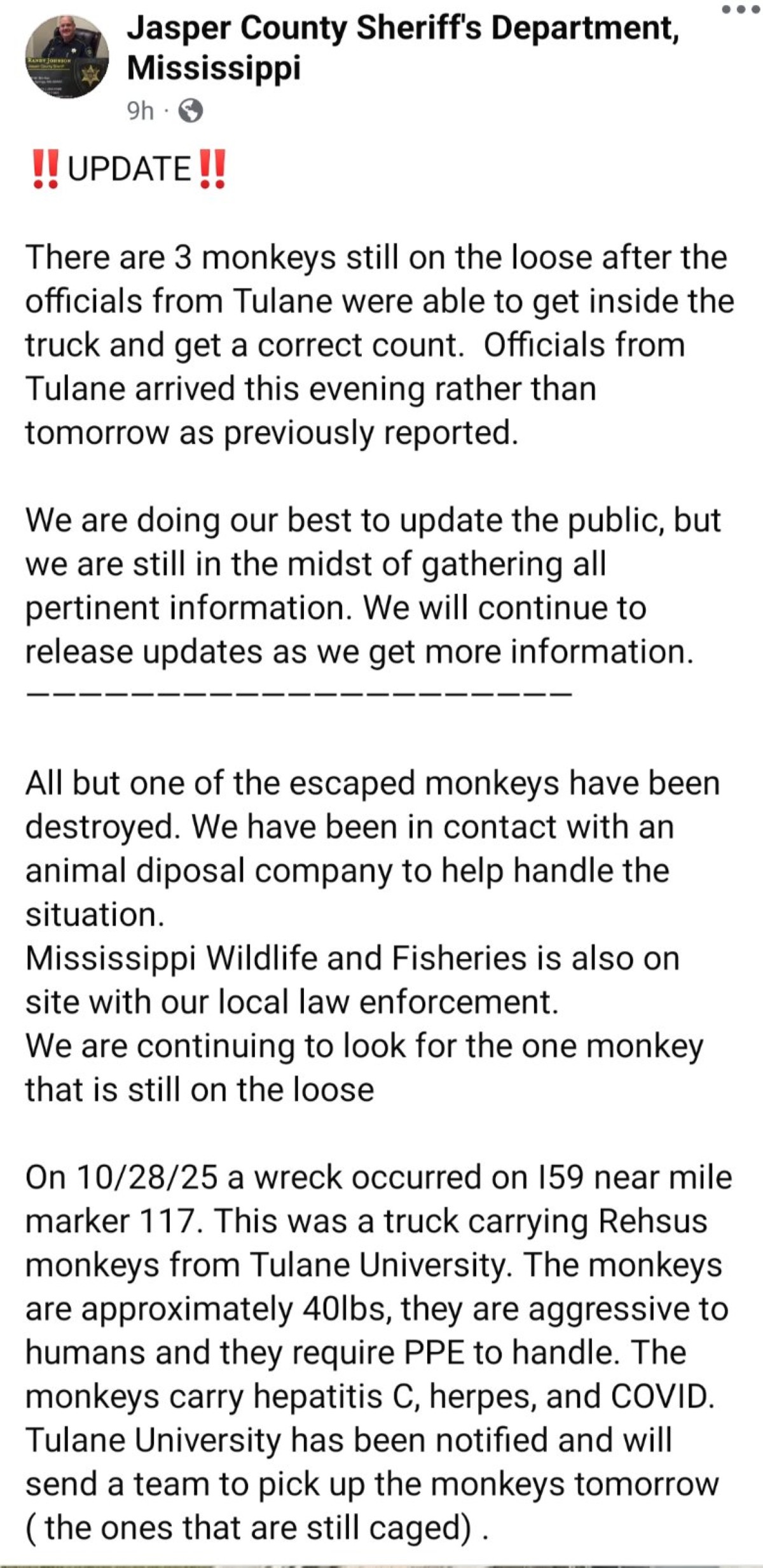 Sa isang Facebook post ng Jasper County Sheriff’s Department nitong Miyerkules, Oktubre 29, sinabing lulan umano ng truck ang mga rhesus monkey mula sa Tulane University nang mangyari ang insidente.