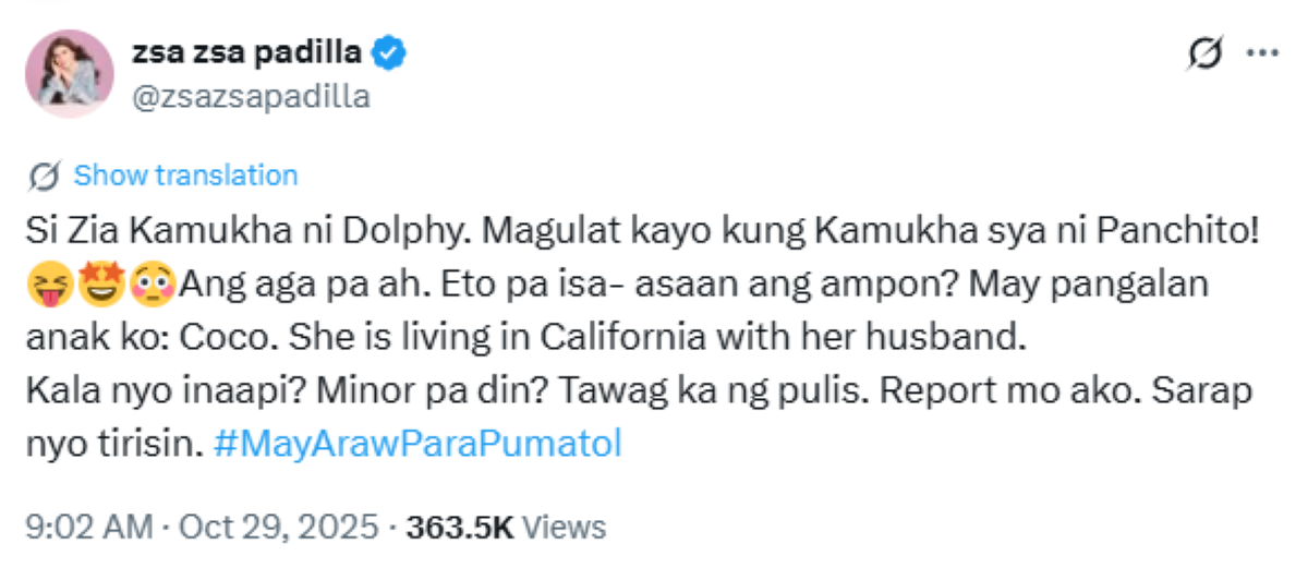 Photo courtesy: Screenshot from Zsa Zsa Padilla/X