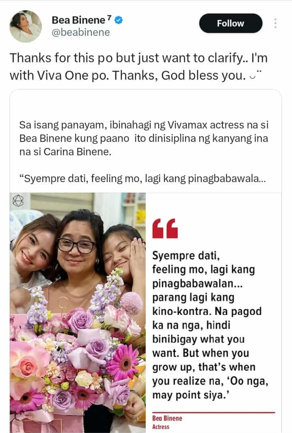 Ang nasabing post ay patungkol sa isang panayam sa aktres, kung saan ibinahagi niya kung paano ba siya dinisiplina ang kaniyang ina na si Carina Binene.