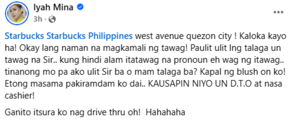 "Iyah Mina Be fair din Mima. Pag drive thru, boses lang ang naririnig initially, eh hindi nman feminine ang boses mo. Kaya obvioulsy, pag nakita na ang face mo, natural na magtatanong kung mam ba o sir. Nakakainis lang din kc binibigyan nyo ng burden yung mga tao and you are holding people accountable para sa personal preference nyo. And the fact na nagtnong siya kung sir or mam, I think he is reasonable. That’s not fair!"