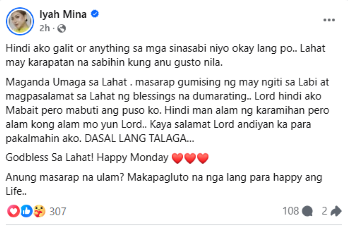 May mensahe ang aktres at komedyanteng si Iyah Mina sa samu't saring reaksiyon at komentong natanggap niya dahil sa Facebook post niya noong Linggo, Nobyembre 2.