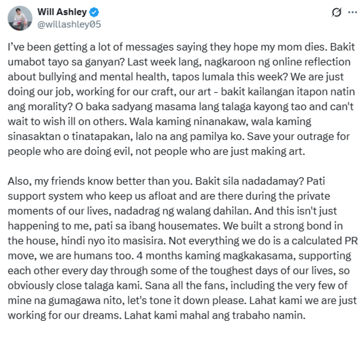 Sa X post ni Will nitong Lunes, Nobyembre 3, ibinahagi niya ang screenshot ng mensahe sa kaniya ng basher kung saan minura siya at dinamay pa ang nanay niya, na tinawag na "pangit."