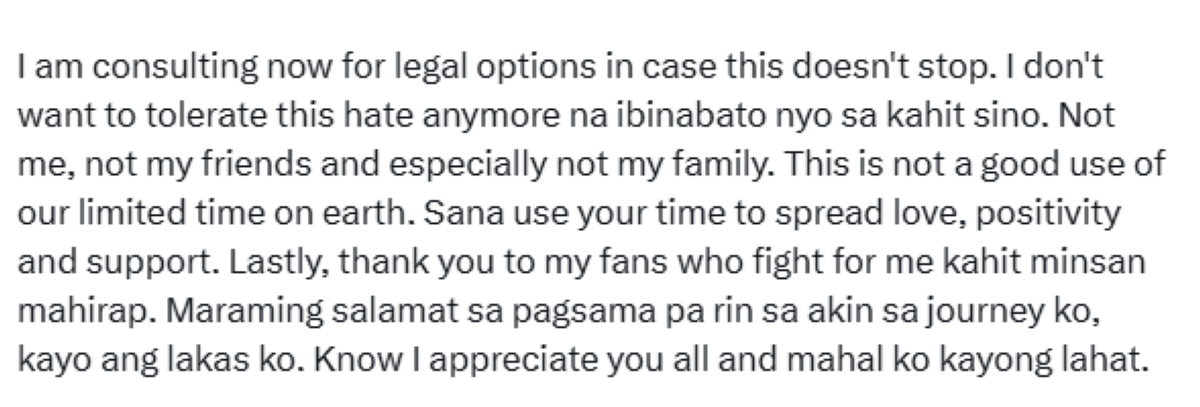 Kaya naman banta niya sa haters at bashers, "I am consulting now for legal options in case this doesn't stop. I don't want to tolerate this hate anymore na ibinabato nyo sa kahit sino."