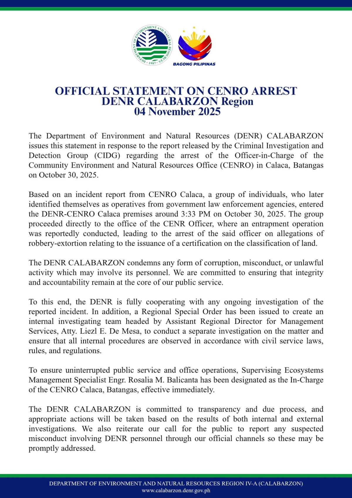 “The Department of Environment and Natural Resources (DENR) CALABARZON issues this statement in response to the report released by the Criminal Investigation and Detection Group (CIDG) regarding the arrest of the Officer-in-Charge of the Community Environment and Natural Resources Office (CENRO) in Calaca, Batangas on October 30, 2025,” panimula nila.