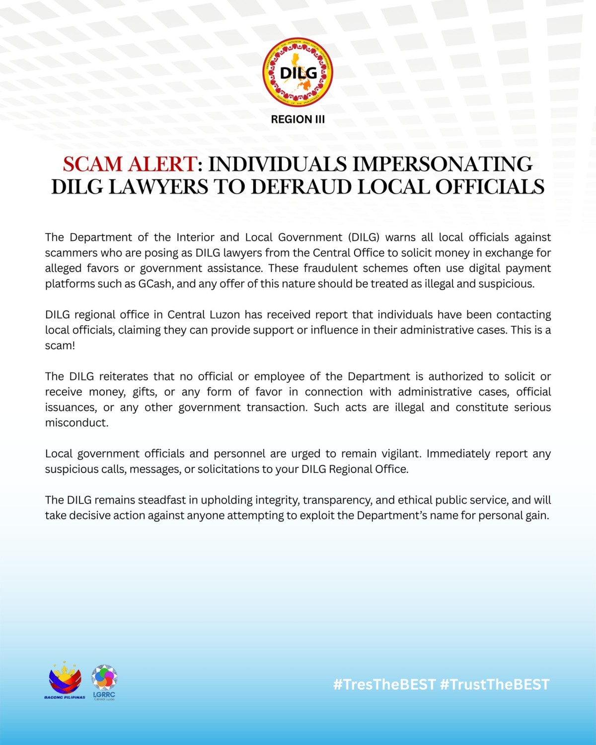 “The Department of the Interior and Local Government (DILG) warns all local officials against scammers who are posing as DILG lawyers from the Central Office to solicit money in exchange for alleged favors or government assistance. These fraudulent schemes often use digital payment platforms such as GCash, and any offer of this nature should be treated as illegal and suspicious,” panimula ng DILG.