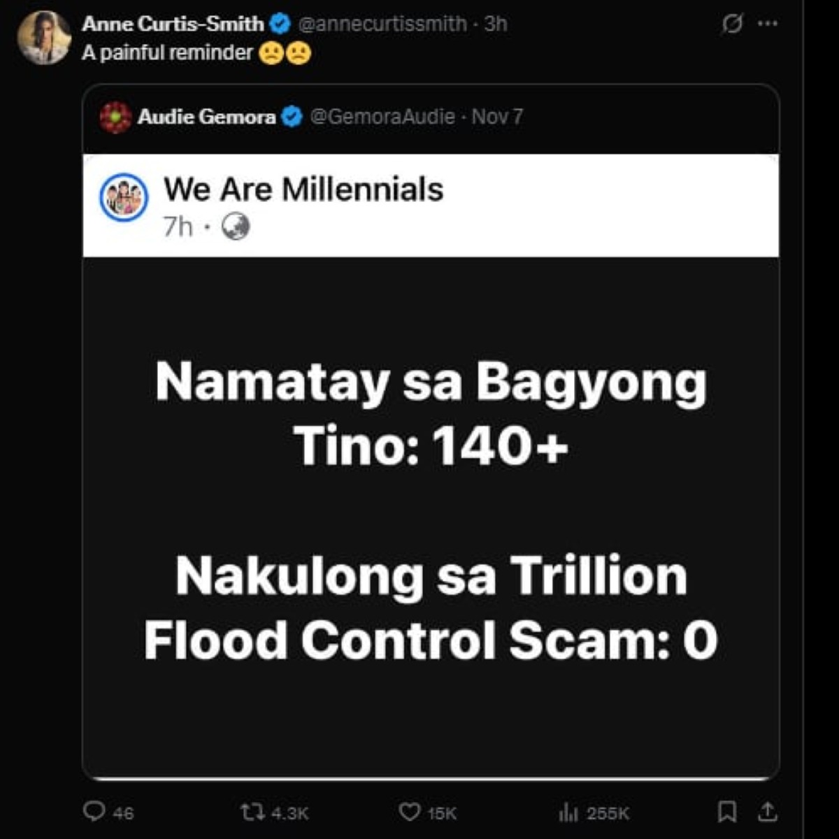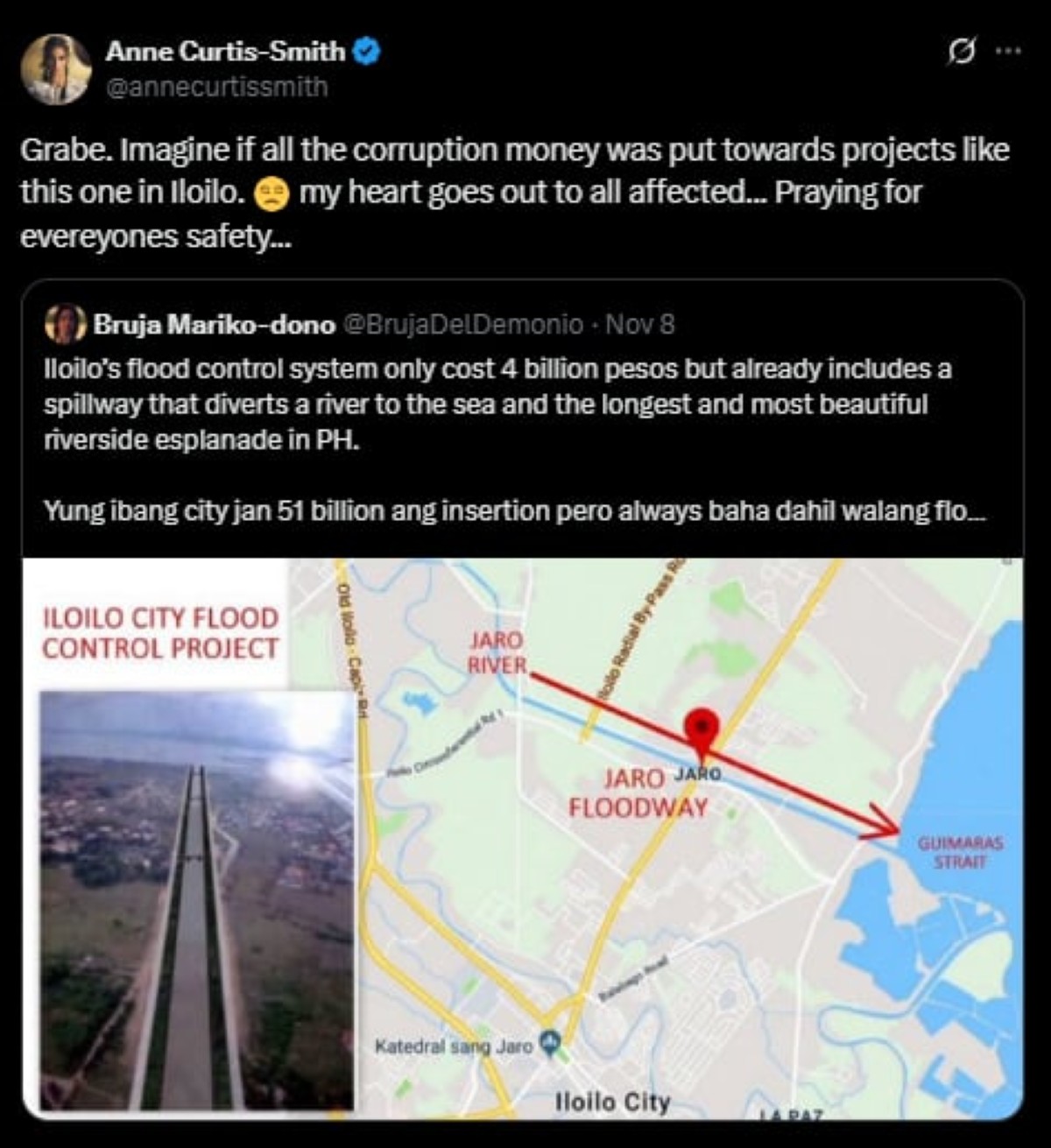“Grabe. Imagine if all the corruption money was put towards projects like this one in Iloilo.. My heart goes out to all affected... Praying for everyone's safety…,” ani Anne.