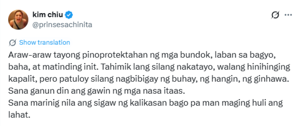 Naglabas ng kaniyang pananaw si "It's Showtime" host at Kapamilya star Kim Chiu hinggil sa mga bundok na nagsisilbing proteksyon sa Luzon at nagpapahina sa malalakas na bagyong pumapasok at nananalasa sa bansa.