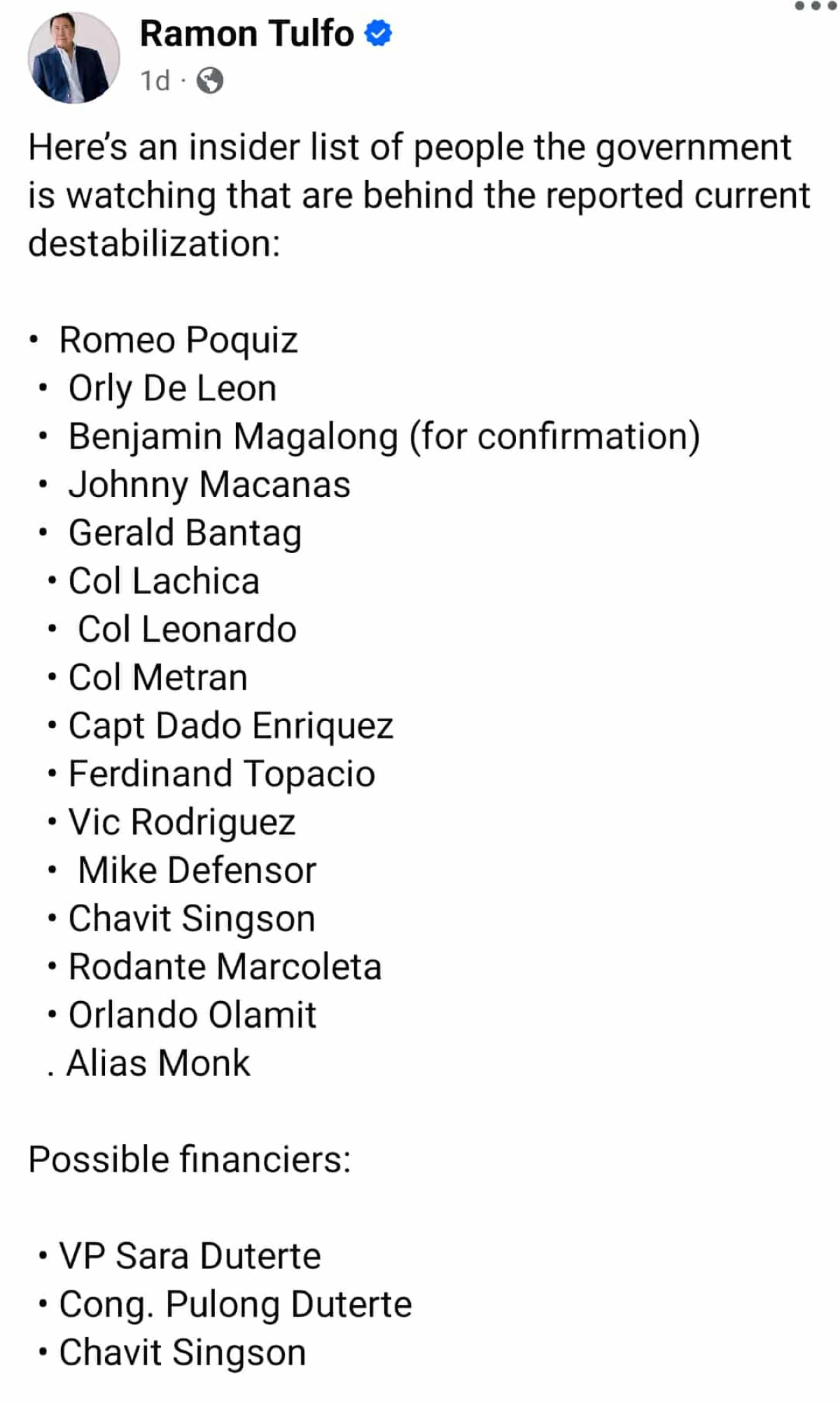 Matatandaang bukod kay Magalong, narito ang iba pang kabilang sa listahang inilabas ni Tulfo na nagbabalak umano ng destabilisasyon: Romeo Poquiz, Orly De Leon, Johnny Macanas, Gerald Bantag, Col Lachica, Col Leonardo, Col Metran, Capt Dado Enriquez, Ferdinand Topacio, Vic Rodriguez, Mike Defensor, Chavit Singson, Rodante Marcoleta, Orlando Olamit, at Alias Monk.