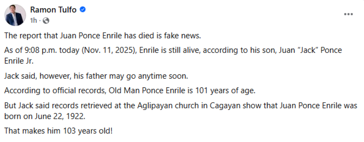 "As of 9:08 p.m. today (Nov. 11, 2025), Enrile is still alive, according to his son, Juan “Jack” Ponce Enrile Jr. Jack said, however, his father may go anytime soon."