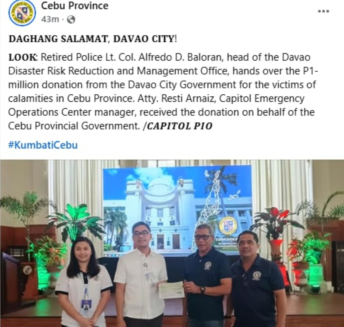 Sa ibinahaging Facebook post ng Cebu Province nitong Huwebes, Nobyembre 13, nagpapasalamat ang lalawigan sa ₱1 milyong donasyon mula sa Davao City LGU, na personal na inihatid ni Retired Police Lt. Col. Alfredo D. Baloran, puno ng Davao Disaster Risk Reduction and Management Office (CDRRMO).