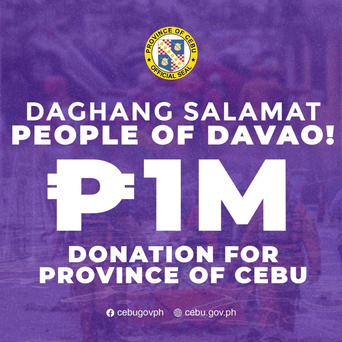 Sa hiwalay naman na post, nagpasalamat din si Cebu Governor Pam Baricuatro sa tulong na hatid ng mga Dabawenyos sa kanilang lalawigan.